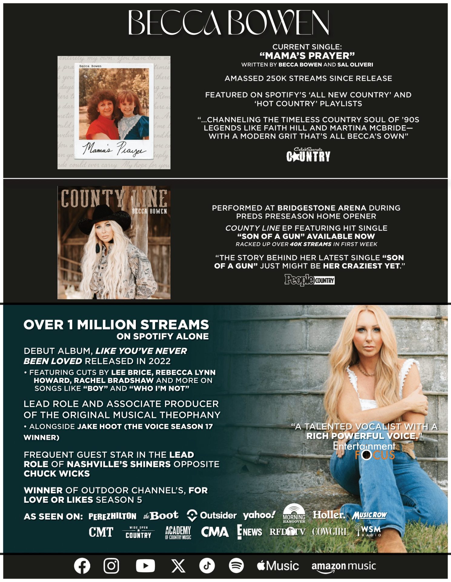 With her sensational voice, magnetic presence, and unwavering authenticity, Becca Bowen stands poised as one of country music’s brightest and boldest new stars.
